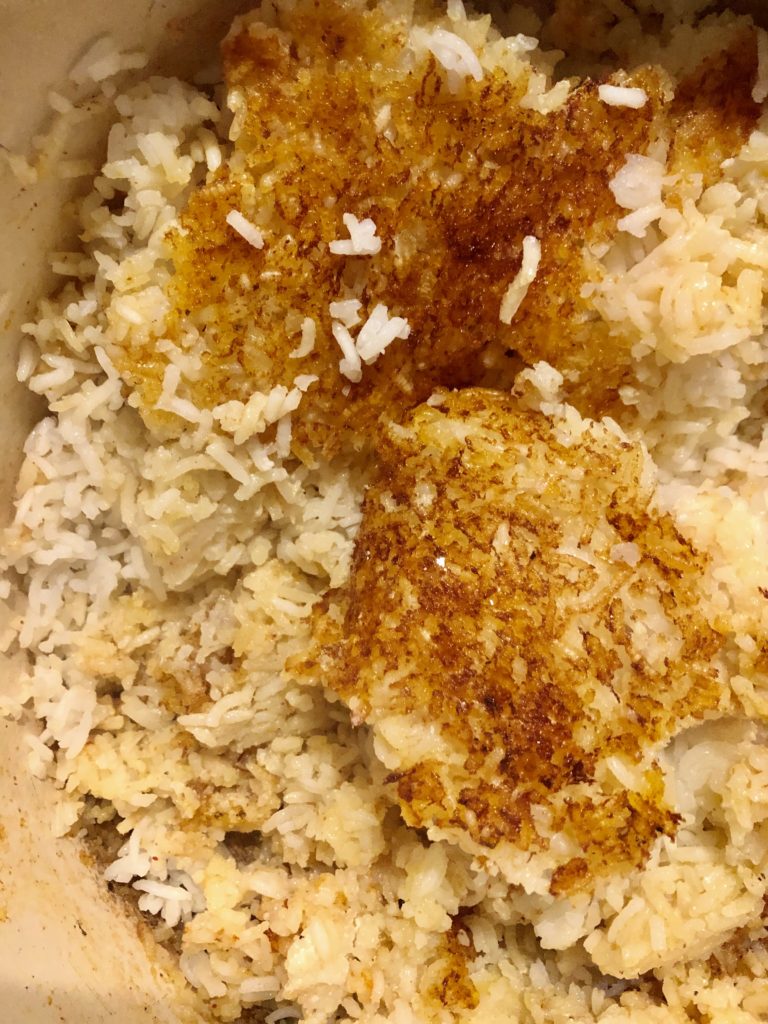 This is a delicate dance between perfect and burnt. If its perfect, you will be able to slide/scrape a crispy golden layer of toasty heavenly rice over in the pan in a gorgeous chunk. I love this rice and it is the perfect side to just about anything.